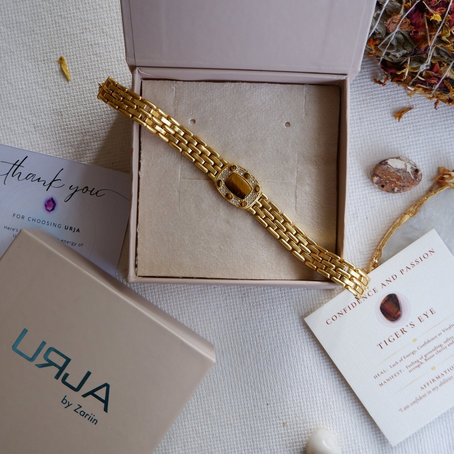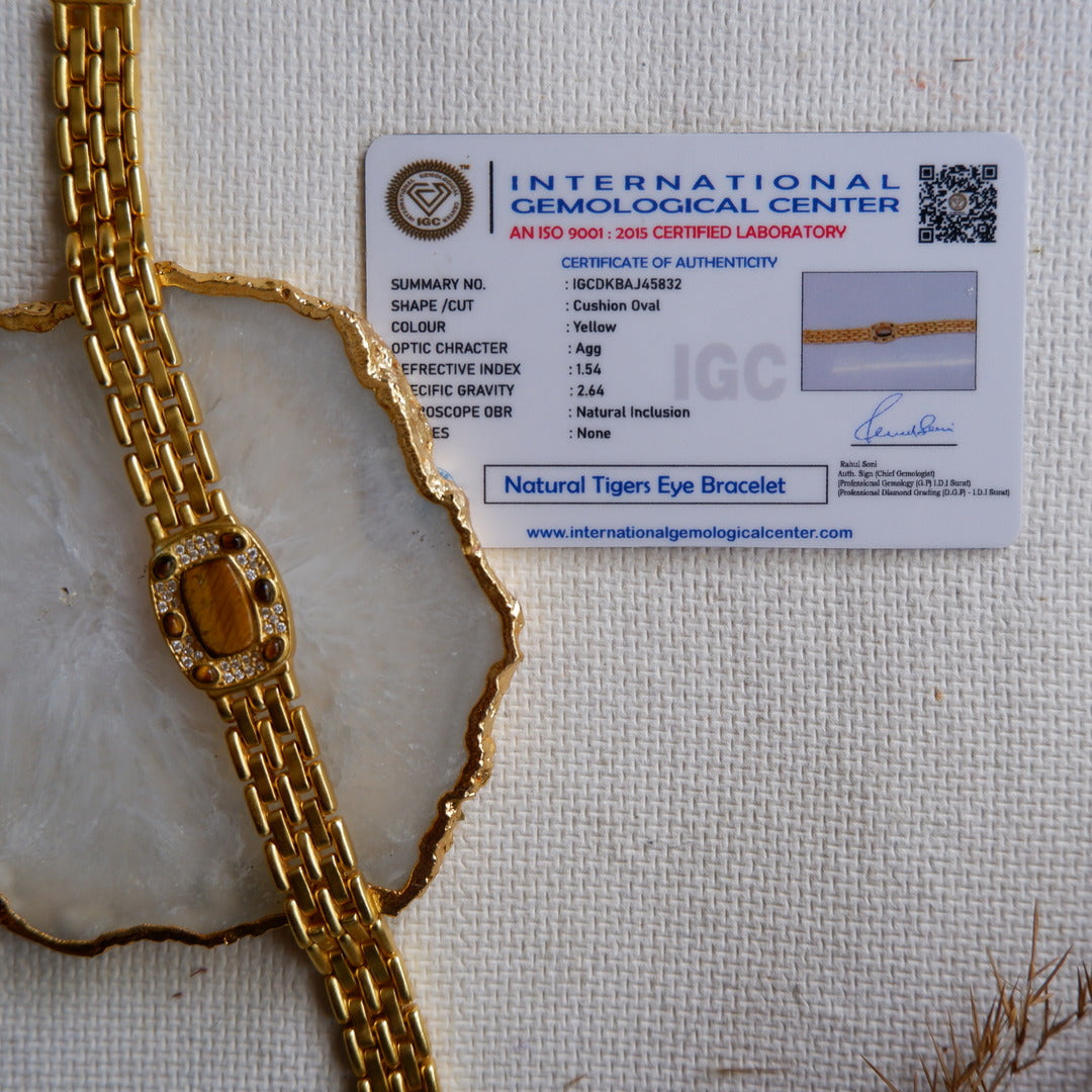 With a unisex gold-plated strap that combines vintage and modern elements, this bracelet is a versatile accessory that seamlessly integrates into your daily wardrobe, allowing you to benefit from the empowering energies of Tiger's Eye.