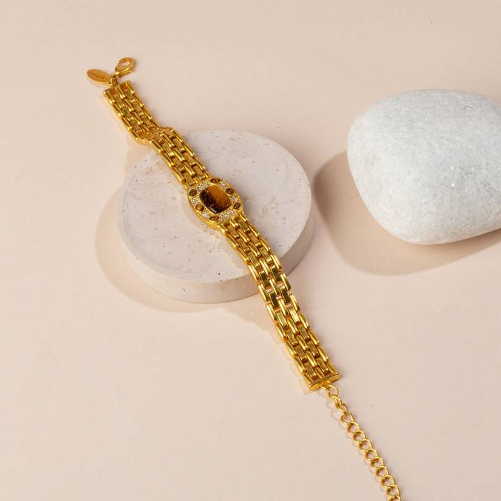 This 22kt gold-plated bracelet features Tiger's Eye, a powerful stone known for its grounding properties. Connected to the base chakras and the energies of the Sun and Earth, it is believed to boost confidence, willpower, and inner strength, while channeling the spirit of the tiger.
