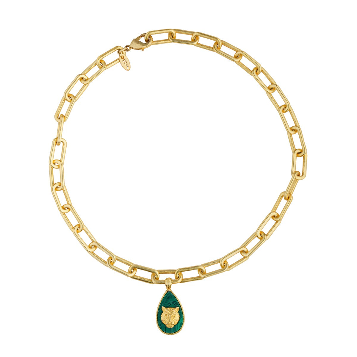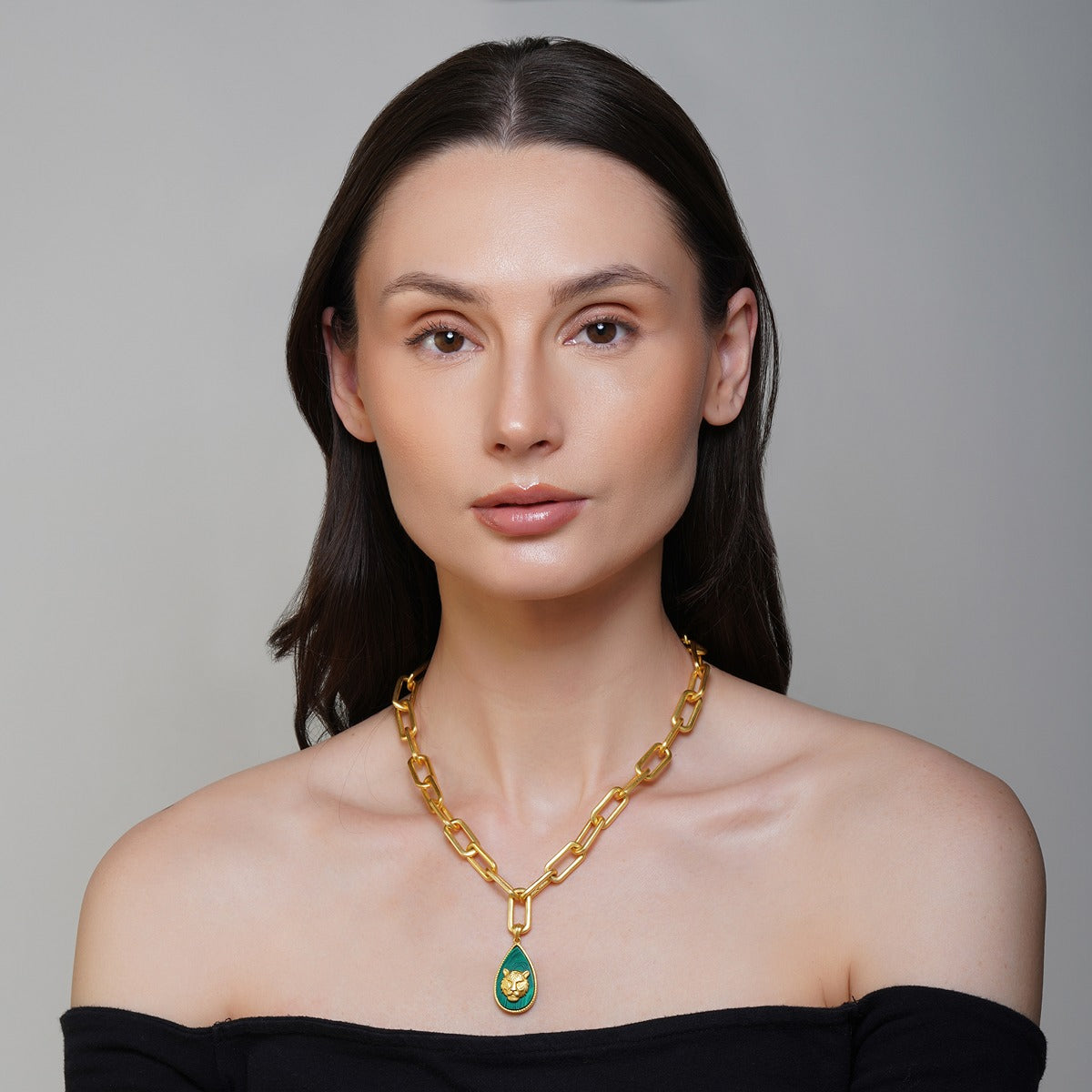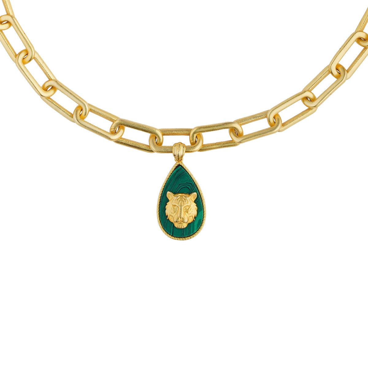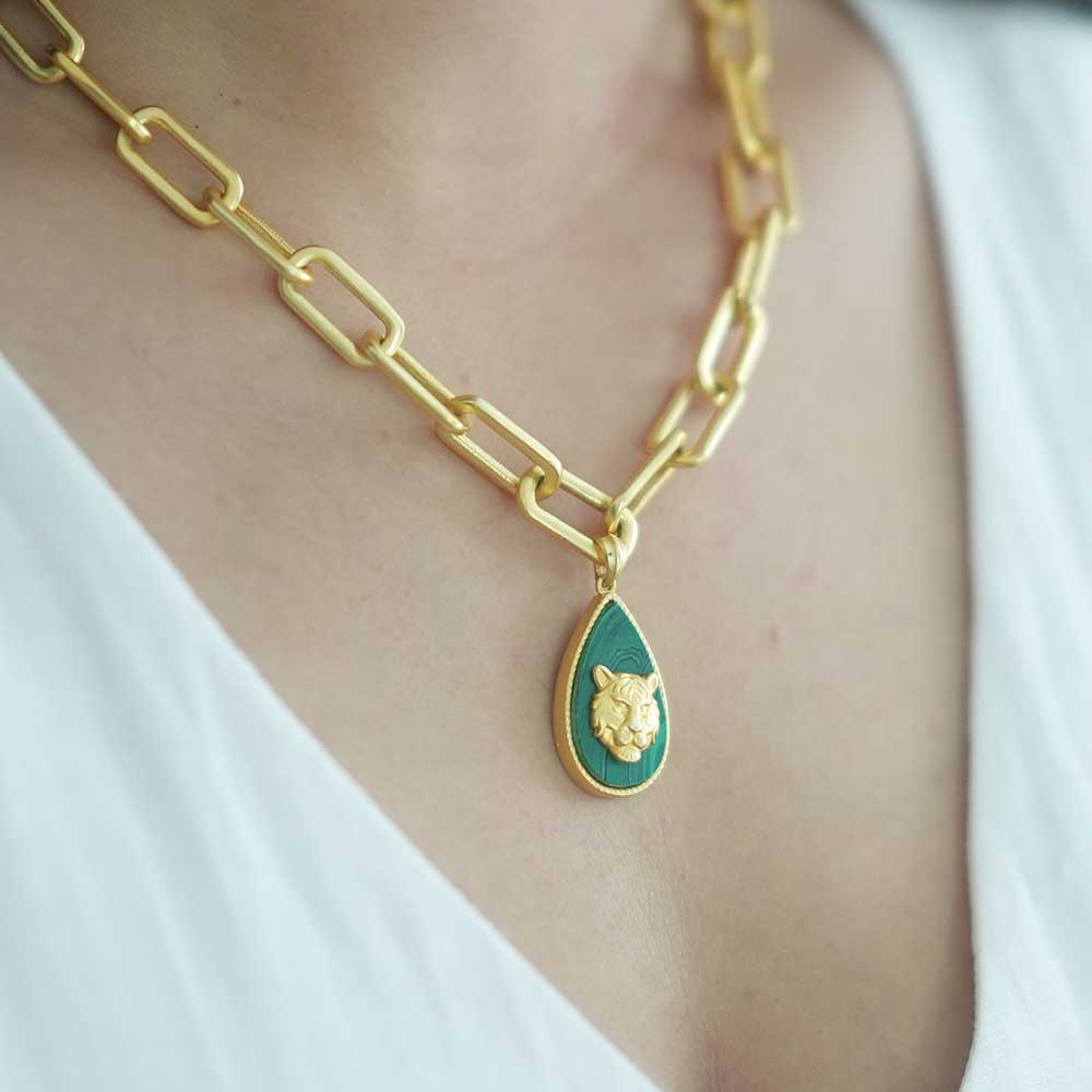 22kt gold plated and handcrafted tiger necklace with a chunky link chain. Inspired by the strength, resilience and graceful embrace of a tiger. Teardrop shaped crystal pendant is set with an intricately detailed and fascinating tigress’ face. Teardrop shape is symbolic of the feminine energy linked to the enduring nature of women with a timeless appeal. The tigress’ face signifies the strength, softness and grace of womanhood. The healing gemstone Malachite is associated to the heart chakra, balances emotions, eases one of the menstrual pain and balances hormones. These elements are designed, combined and conceptualised to work as perfect talismans to make an expressive statement with the tiger necklace.