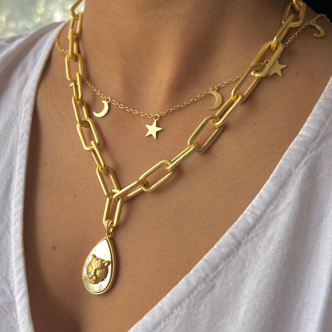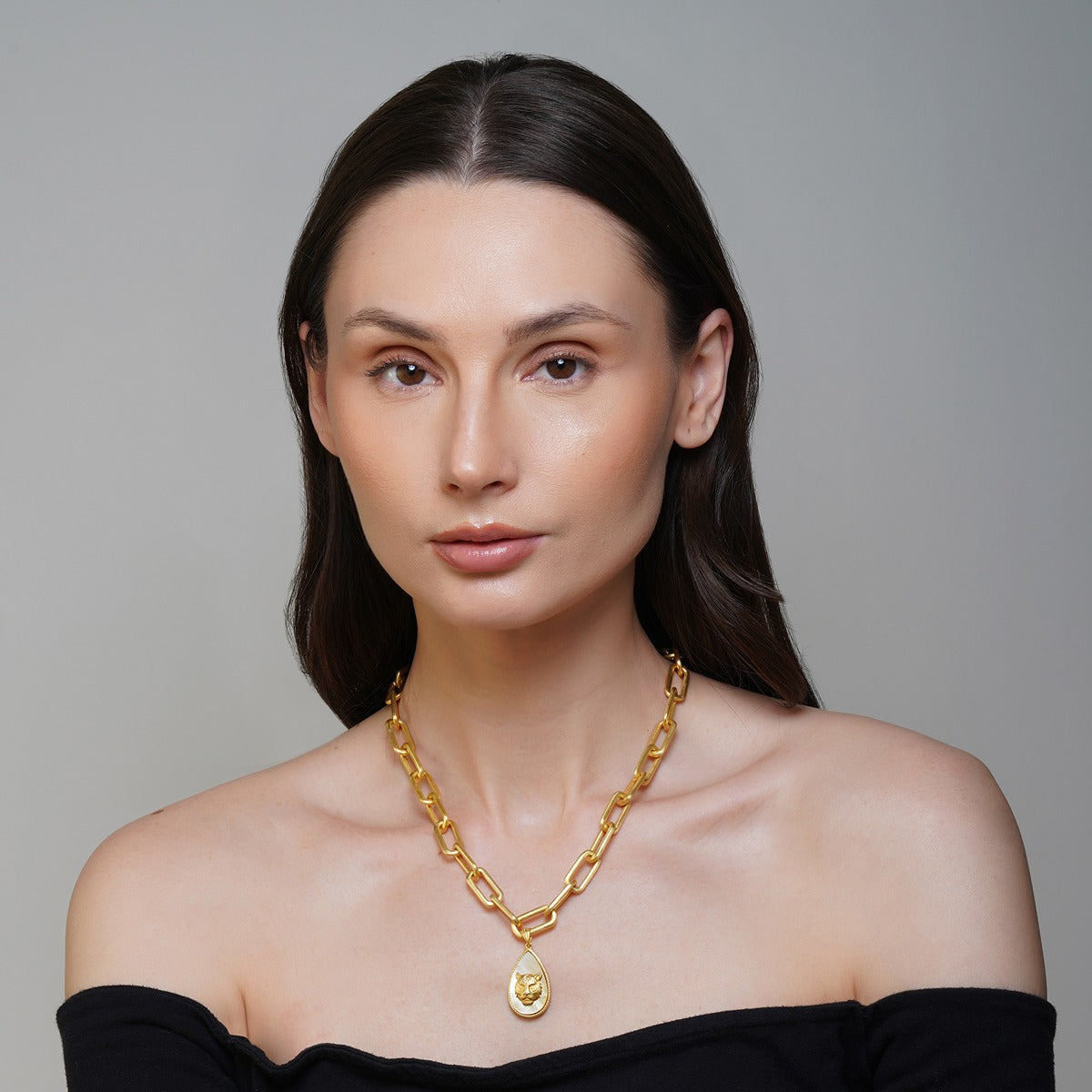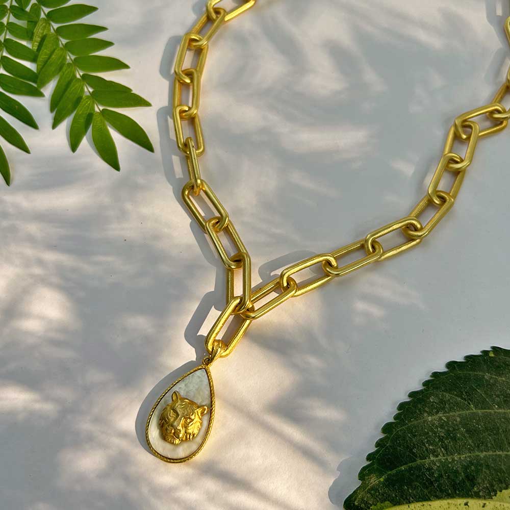 22kt gold plated and handcrafted tiger necklace with a chunky link chain. Inspired by the strength, resilience and graceful embrace of a tiger. Teardrop shaped crystal pendant is set with an intricately detailed and fascinating tigress’ face. Teardrop shape is symbolic of the feminine energy linked to the enduring nature of women with a timeless appeal. The tigress’ face signifies the strength, softness and grace of womanhood. The healing gemstone Mother of Pearl connects you to your inner goddess, is nurturing, boosts feminine energy and is calming. These elements are designed, combined and conceptualised to work as perfect talismans to make an expressive statement with the tiger necklace.