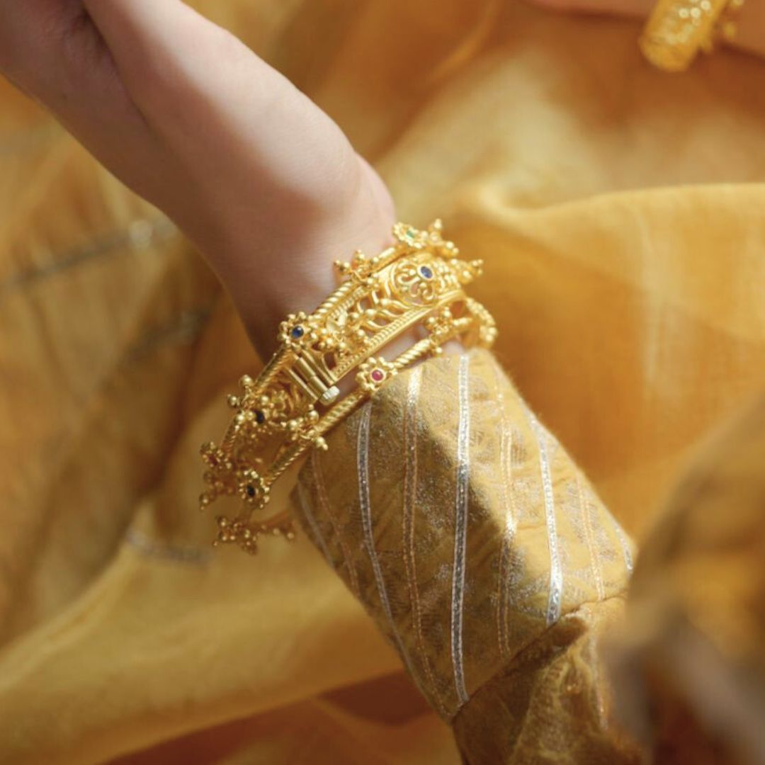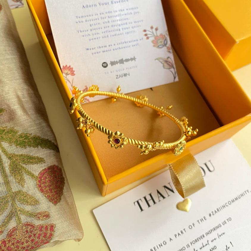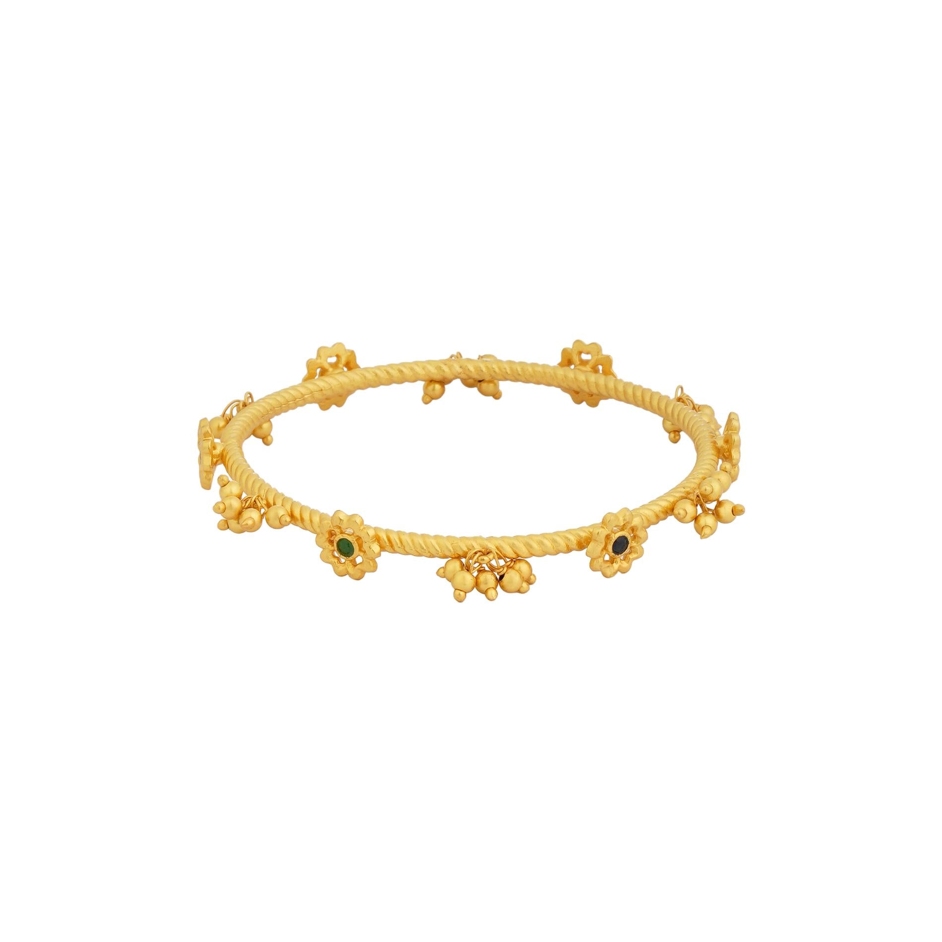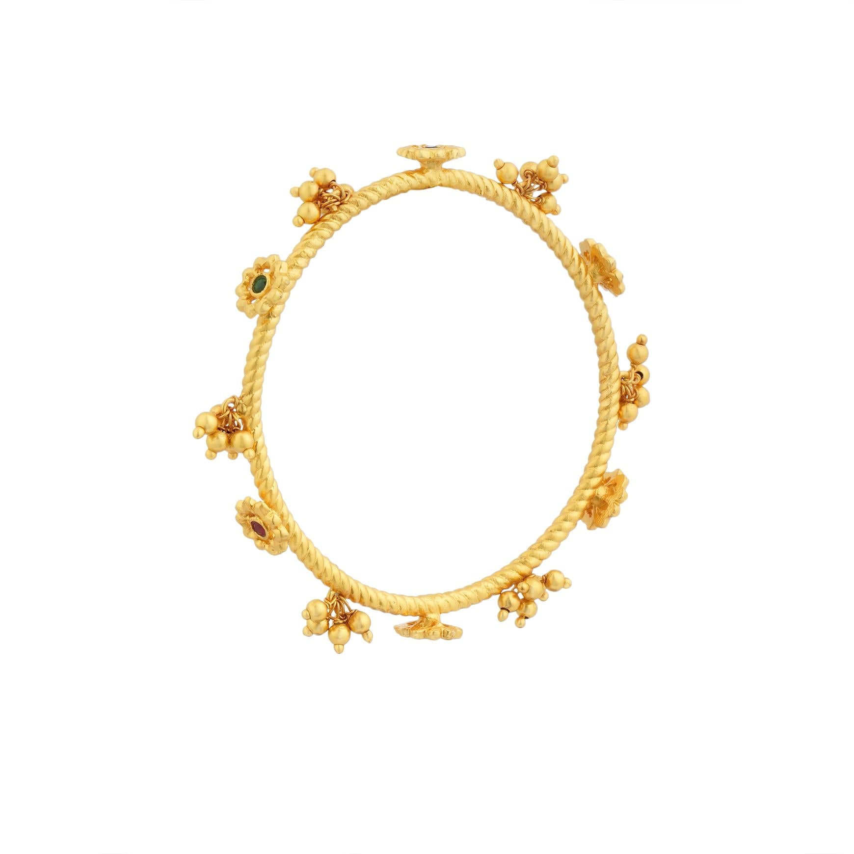 A feminine take on the classic twisted texture bangle, this 22kt gold plated is dressed with dainty beads and floral motifs placed in graceful alternation. Studded with Emerald Green, Ruby Red, and Blue cubic zircons, the vibrant palette adds character, colour, and versatility — making it a perfect companion to both festive finery and everyday elegance. Light yet detailed, it’s a piece that brings subtle artistry to your wrist with every wear. Wear it by itself, stack with different ones or more of its kind for a more eclectic and impactful approach.