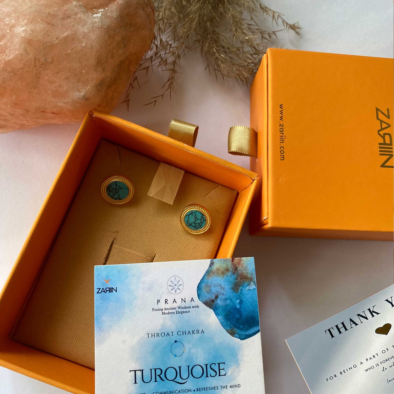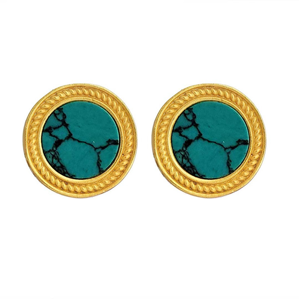 Lend a perfect pop of blue green with these 22kt gold plated circular Turquoise studs. The earrings not only make a stylish modern accessory but fuse ancient wisdom with elegant aesthetics. Turquoise is cherished for its calming and healing energies and the stud earrings are an effortless way to fuse the goodness of the gemstone into your daily dressing. It boosts relationships by bringing stability and harmony and is believed to be a great stone for couples signifying enduring love.