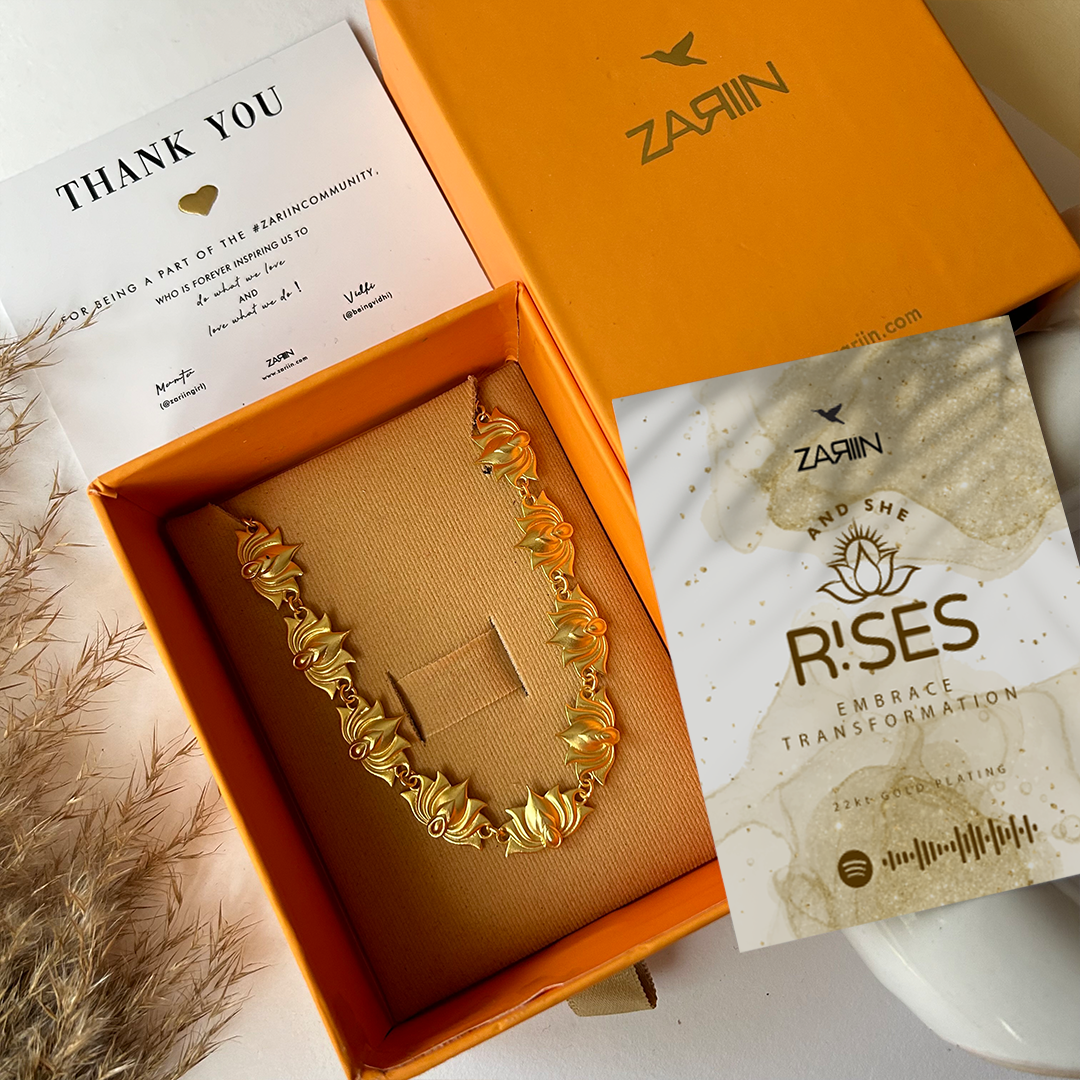 Adorned with intricate lotus motifs, the jewelry becomes a talisman of empowerment and invites you to embark on the journey of self discovery.