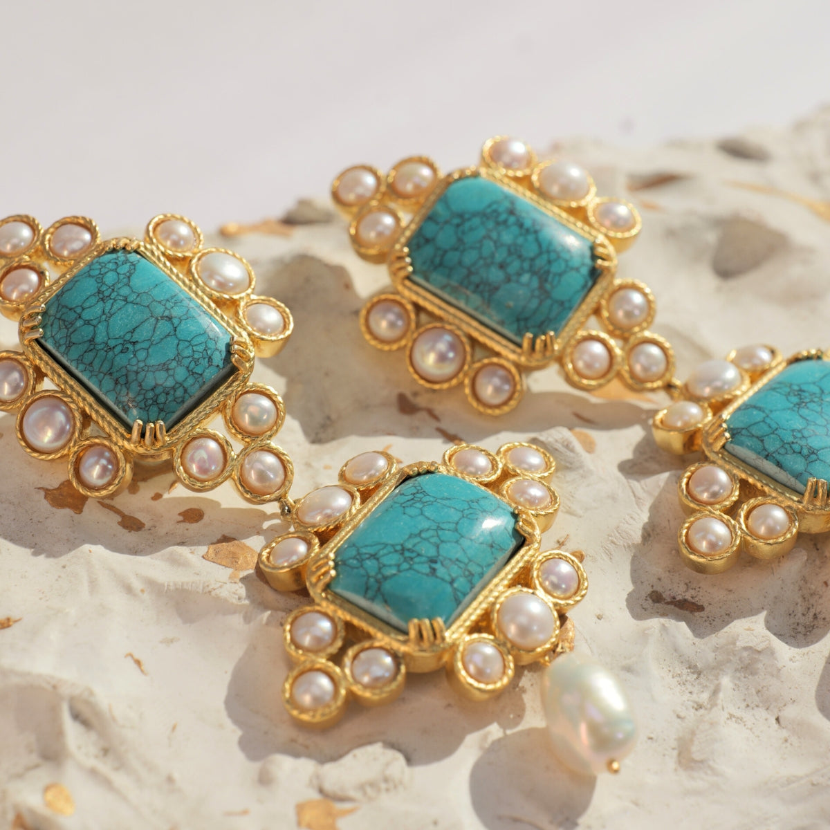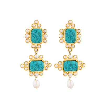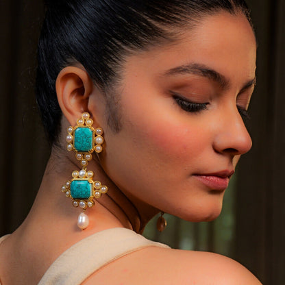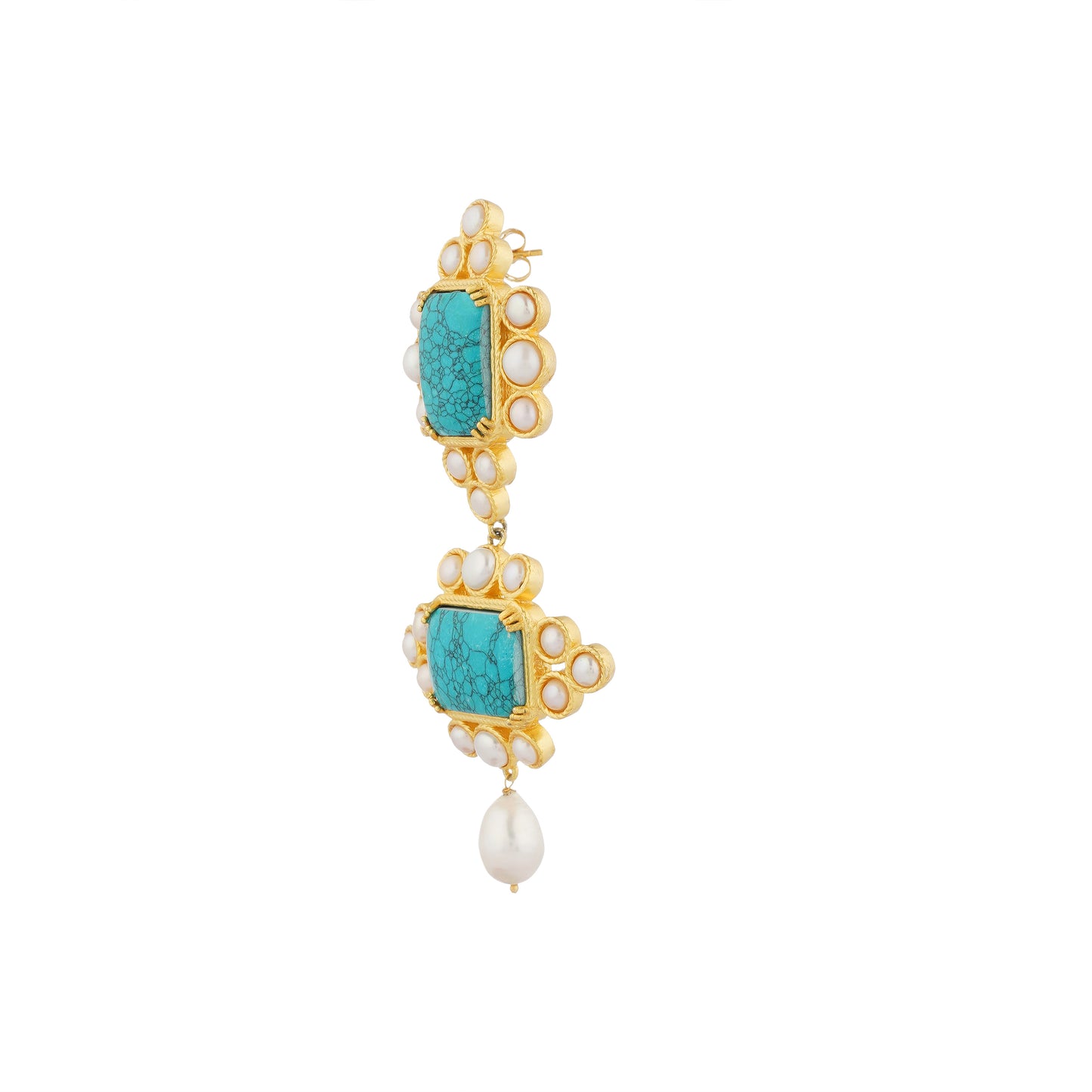 These vibrant pair of statement earrings are designed to stand out and are all about effortless elegance and glamour. If you are looking to complete your look with that one stunning pair of earrings, then these are what you are looking for. Vibrant blue Turquoise cabochons are laced with pearls on the sides. The combination of blue of the Turquoise and pearls, is an ode to the spirit of the ocean and its wonders. The 22kt gold plated pair is finished with drops of baroque pearls that lend an elegant touch.